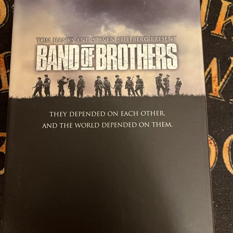 Band of Brothers DVD-samling med flere episoder. Serien omhandler andre verdenskrig og følger en gruppe amerikanske soldater. Inkluderer omslag og bokser.