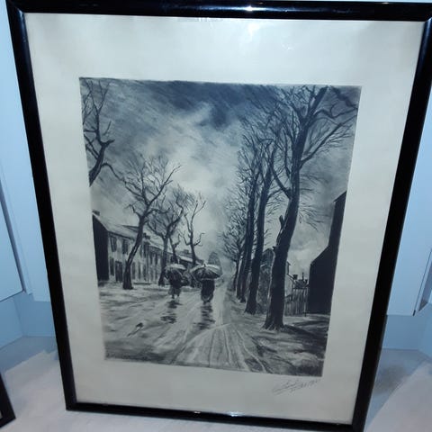 To gamle tegninger av Gamlebyen i Fredrikstad, med glass og ramme.