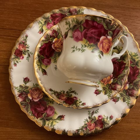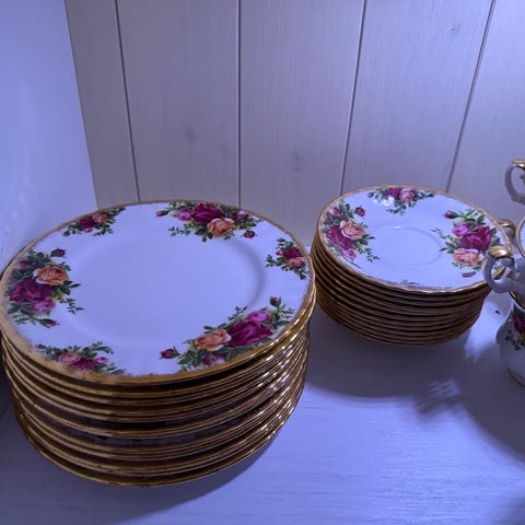 Serviset har et vakkert rosemønster i rødt, rosa og gult, med dekorativ gullkant som gir et eksklusivt preg.