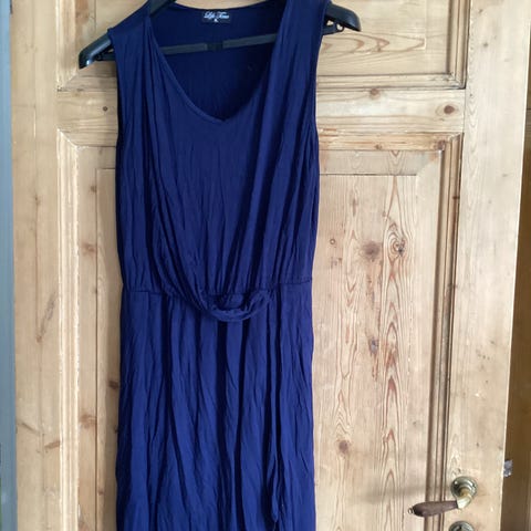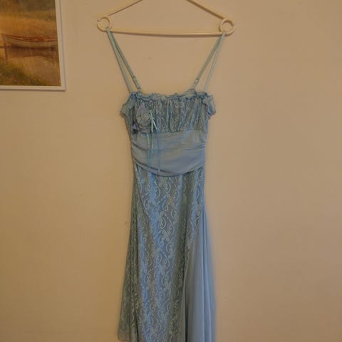 Kjole til spesiell anledning i blå farge, størrelse XL for kvinner. Kjolen har dekorative detaljer og blomstermotiv, egnet for formelle eller spesielle anledninger. Merke er Lmc (Love my clothing). Kan hentes i Tønsberg eller sendes i posten.