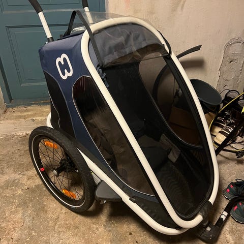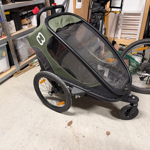 Vognen er pent brukt. Den er primært brukt som sykkelvogn - ski- og løpetilbehøret er brukt 5-10 ganger.
