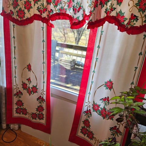 2 stk Nydelige julegardiner med Dompap motiv. Bredde 196 cm. Laget av lin og polyester. Vaskes på 30 grader Selges for 100kr stk helst samlet.