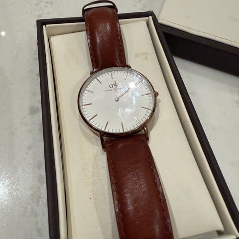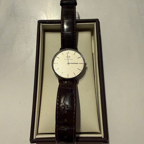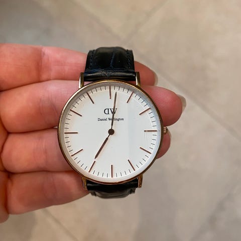 Daniel Wellington dame klokke med hvit urskive og svart skinnrem