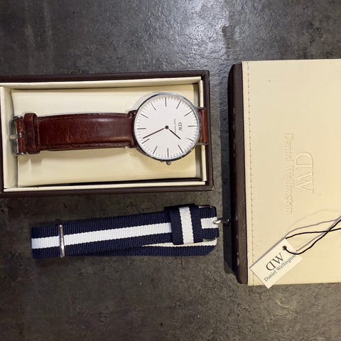 Daniel Wellington dame klokke med hvit urskive og skinnrem. Leveres med en ekstra stoffreim