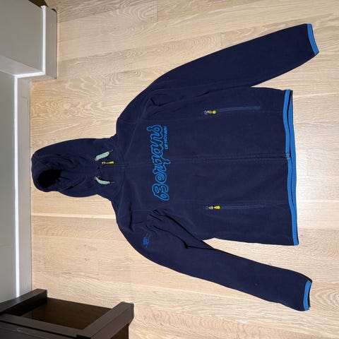 Bergans jakke i størrelse 152 for jente. Vattert. Polyester/bomull-blanding. En flekk på bakside arm, litt slitasje ved knapper, og reparert ved glidelås: se bilder. Fungerer ellers fint.