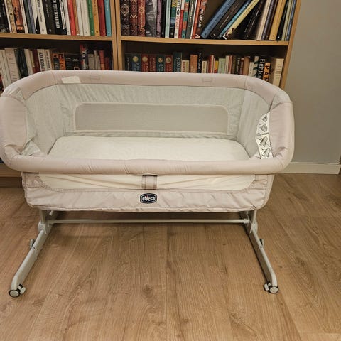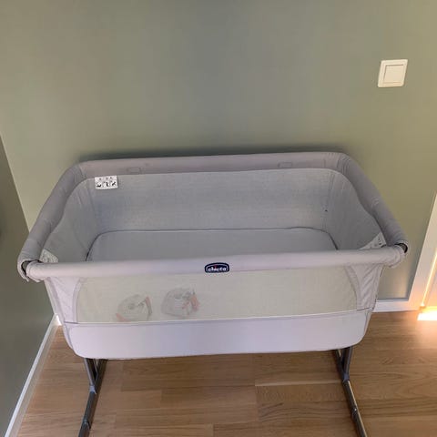 Chicco bedside crib. Sengen er designet for å plasseres ved siden av foreldreseng, og har justerbare ben for tilpasning til ulike høyder. Laget med mesh-sider for god ventilasjon og oversikt. Inkluderer madrass og sikkerhetssele