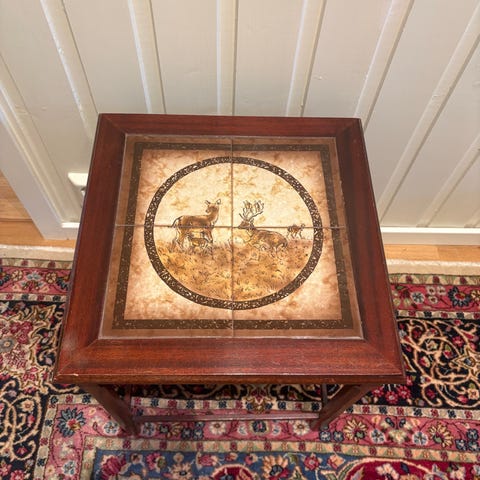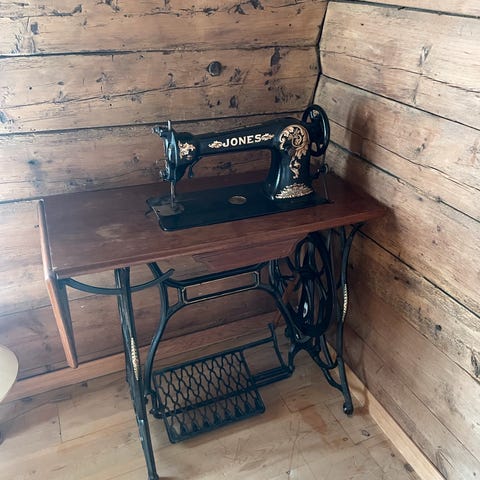 Husqvarna symaskin med original treplate og støpejernsramme gis bort. Maskinen har dekorative detaljer og er utstyrt med en pedalmekanisme. Skuffen er hel, men fronten på skuffeinnsatsen mangler litt av treverket, slik at skuffen henger litt skrått.