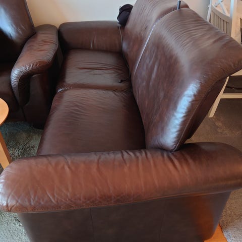 Selger en pen og komfortabel skinnsofa bestående av 2 deler. Sofaen er i god stand og kommer fra et røyk- og dyrefritt hjem.