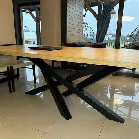 Selger et fint spisebord fra feel, kjøpt for tre år siden. Foliert MDF plate med grålig eik og bein i matt svart metall. Tre bruksmerker på hjørnene som er avbildet.