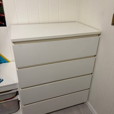 Selger en pent brukt IKEA malm kommode med seks skuffer, da jeg dessverre ikke har plass til den lenger. Kommet en liten skade helt bakerst i høyre hjørne på topp-plate (se bilde).