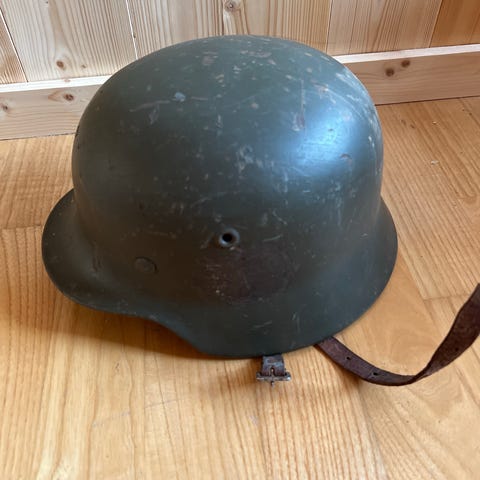 Dette er en tysk hjelm fra 2. verdenskrig, som jeg kjøpte av en som samler og selger av 1. og 2. verdenskrig-minner/objekter, på et marked for 5-6 år siden. Betalte noen tusen for den.