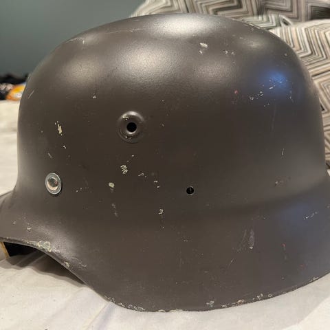 Noe interessant ved denne hjelmen er det som ser ut til å være et kulehull i toppen av hjelmen. Ikke 100% sikker på om det faktisk er et kulehull, det er likevel svært interessant.