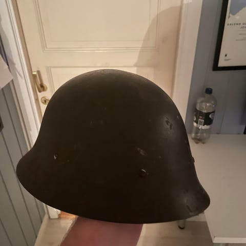Etter å ha letet rundt på nett er jeg rimelig sikker på at dette er en utgave av eller ligner på en m34 politihjelm. Jeg er ikke ekspert på slike hjelmer, så jeg er ikke sikker på om det er akkurat m34-politihjelm, vanskelig å si på grunn av tilstanden. Mange av disse i god stand går for over 5000kr. Derfor legger jeg prisen på denne på rundt 2000kr, som er litt mindre enn det jeg selv gav for den for noen år siden.