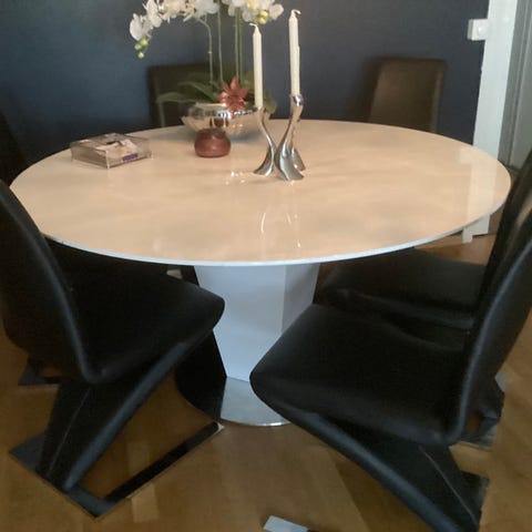 Bord på Ø 145 cm. og høyde 76 cm. Brukt men fortsatt i fin stand. Stoler kan få gratis ved kjøp av bordet om det ønskelig. Bruksmerker på stoler.