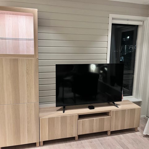 Bestå Tv benk fra ikea i lys eik. Dørene var opprinnelig med glass, men glasset er fjernet og erstattet med lin stoff. Vi har hatt høytalere inne i tv bordet og derfor har det fungert utmerket med linstoffet som skjuler høytalerne men lar lyden komme ut!