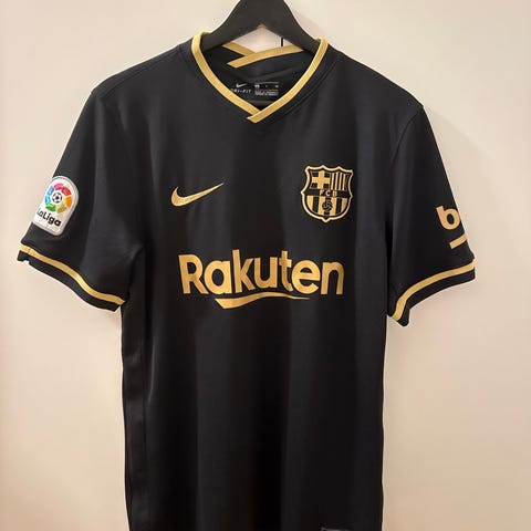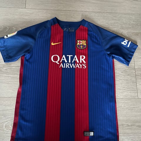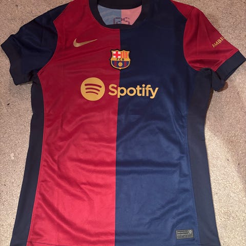 Nike FC Barcelona fotballtrøye i størrelse S. Trøyen har klubbens tradisjonelle farger i rødt og blått, med gule detaljer rundt halsen. Designet for fotballbruk.