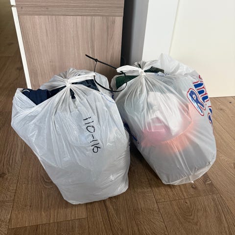 Gøyale barneklær i størrelse 110, flerfarget og unisex. Inkluderer ulike plagg som regnjakke, gensere, bukser og kostyme, egnet for barn. Materialene varierer mellom plaggene.