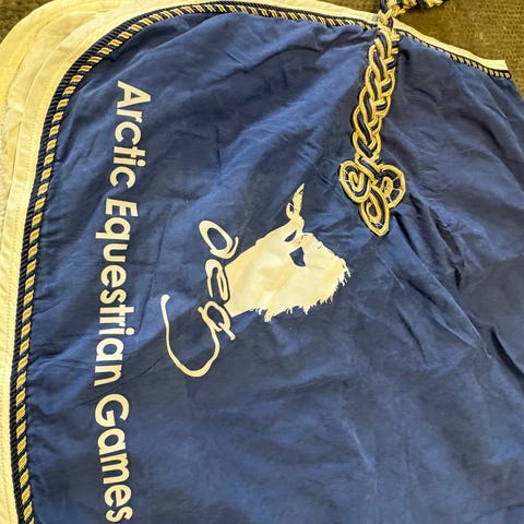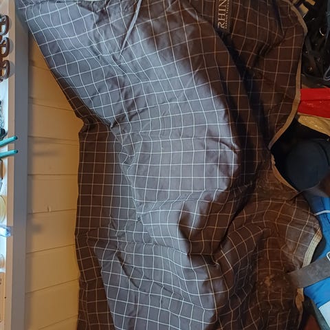 Godt brukt regndekken i str 110 selges. Uten fyll. Fortsatt mye igjen. Den ene stroppen er sydd litt (se bilde). Ellers kunne det hatt godt av en ny runde med impregnering.