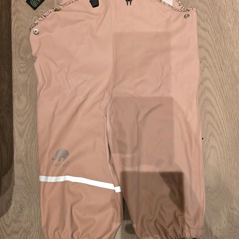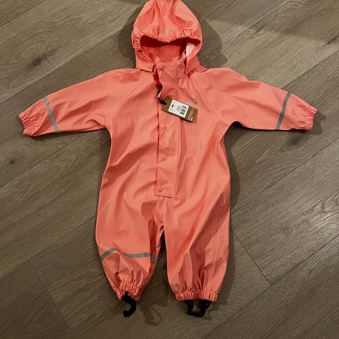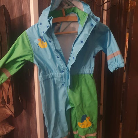 Kjempefin regndress brukt av ett barn i ca et halvt år. Ingen skader, men strikkene under bena er borte. Kjøpes enkelt separat i de fleste barnebutikker eller på nett.
