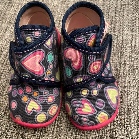 Superfit barne tøfler i størrelse 18, designet for unisex bruk. Tøflene har et motiv av et katteansikt med rød sløyfe, og er laget med mykt materiale for komfort. Egnet for små barn som innendørs fottøy.