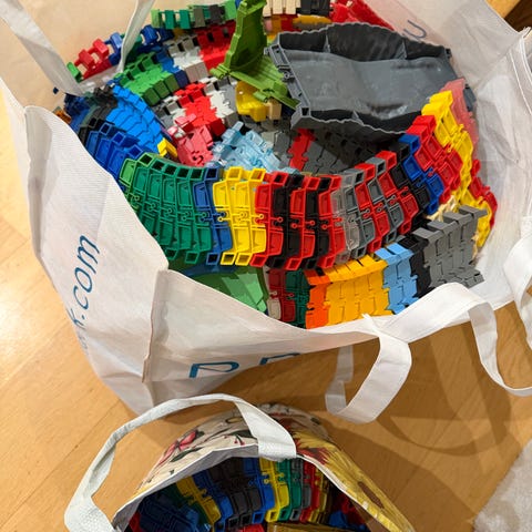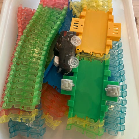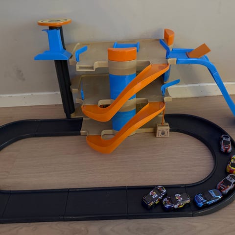Kasse med flexi track bilbane og fem biler. Ikke testet, men funka da de ble satt på loftet for en tid tilbake. Masse baner og gøyale tunneler.