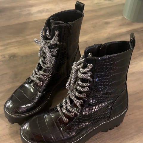 Selger de kule bootsene fra Zara i størrelse 39. De er lite brukt men har en hvit flekk på den ene foten. Se siste bilde. Det første bildet er lånt 🫶🏼