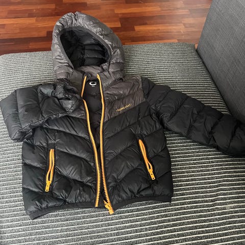 Cubus ytterjakke i blå turkisaktig farge med kule grønne turbukser størrelse 104. Jakken er vind- og vanntett og er designet for unisex bruk.