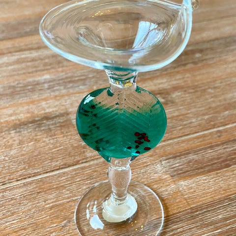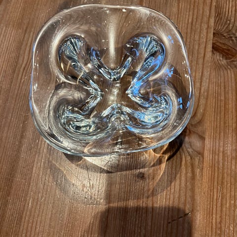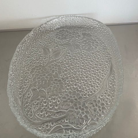 Selger et eldre grønt glassfat med rund form og bølget kant. Laget i glass med en transparent grønn nyanse. Str 38 cm. Det er riper i glasset