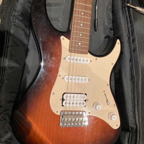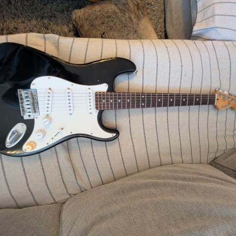 Volcano elektrisk gitar i svart farge. Inkluderer tilbehør som gitarforsterker, kabel, bæreveske, og ekstra strenger. Gitaren har tre single-coil pickup og tremoloarm. Passer for bruk innen ulike musikksjangre.
