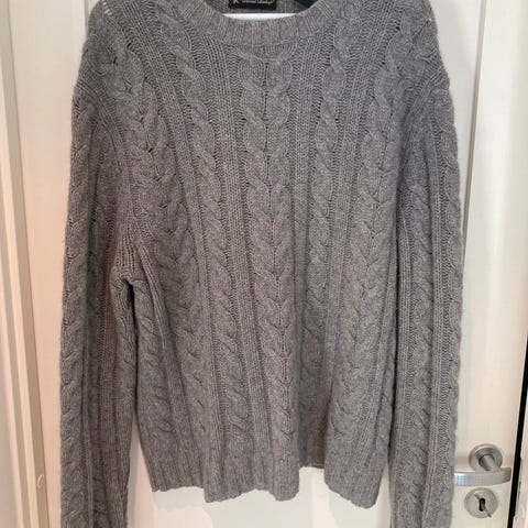 Beige kasjmir genser for menn i størrelse S. Genseren har V-hals og er laget av myk kasjmir. Den har forsterkede albueputer i et lignende beige materiale.