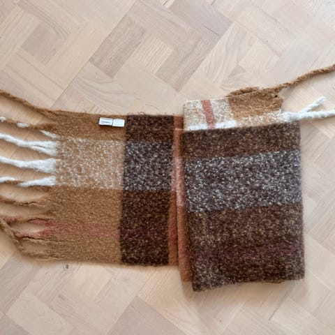 Etiketten er klippet ut, så jeg vet ikke hvilket materiale det er i, men det er et veldig mykt skjerf.