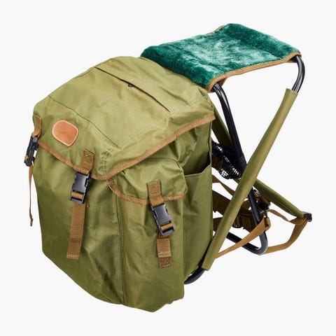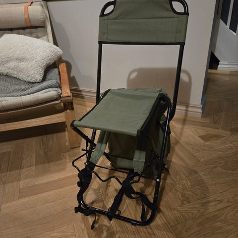 Praktisk tursekk med integrert sammenleggbar stol selges.