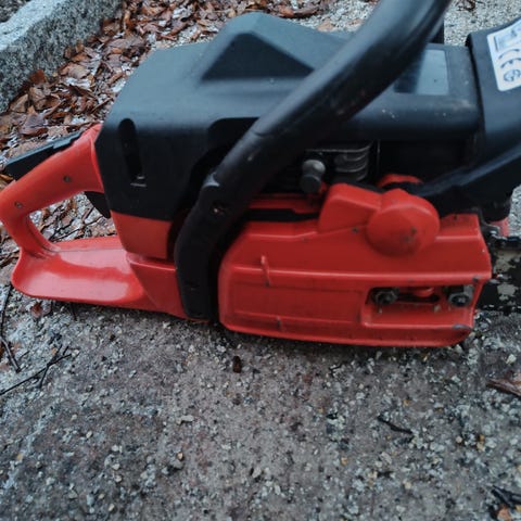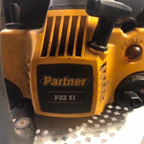 Partner P33 XT motorsag med sverd. Motorsagen er montert med en 33 cm sverd og har en gul og svart farge. Produktet er produsert av Partner, modell P33 XT, og er montert i USA.