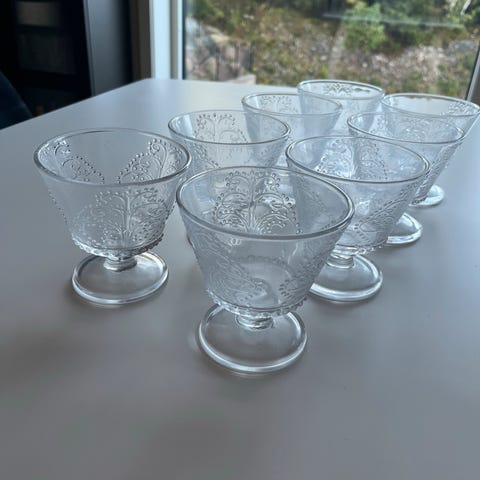 Carla dessertskål i sett med 2 stk. Har totalt 6 stk Skålene er rosa og laget av glass. Egnet til servering av desserter. Kan lev Finnsnes/Målselvomr