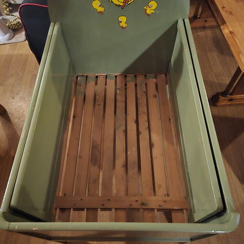 God barneseng som er blitt for liten. Noen bruksmerker, men hel og fin. Madrass leveres med. Avtakbar front.