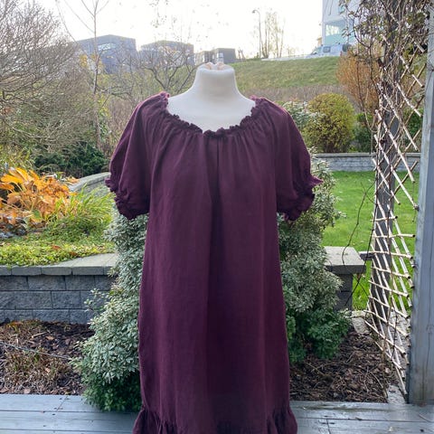 Claire stilig kjole i størrelse 38 for kvinner. Kjolen er lilla og laget av lin. Den har lange ermer med broderidetaljer på ermene.