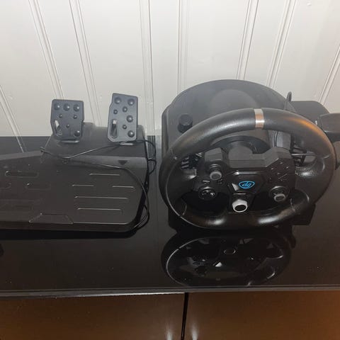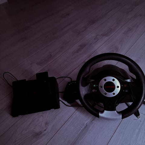 Ceper Ratt og Pedaler spillkontroller med ratt, to pedaler og girspak. Utstyrt med tilkoblingskabler for bruk med kompatible spillkonsoller eller PC. Designet for simulering av kjøreopplevelser i bilspill.
