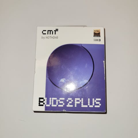 CMF by Nothing Buds 2 trådløse hodetelefoner i svart farge. Produktet leveres i original emballasje med spesifikasjoner og advarsler angitt på baksiden. Hodetelefonene er designet for trådløs bruk.
