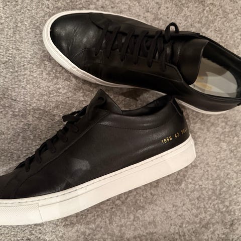 Selger et par Common Projects Achilles Low i en unik lysrosa farge som få har, og som skiller seg ut på en subtil og eksklusiv måte. Dette er en svært populær og tidløs modell, kjent for sitt minimalistiske design og høye kvalitet som vil vare.