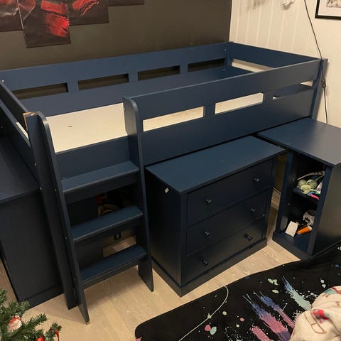 Seng med to store skuffer under, åpen hylle og bord. Fargekombinasjon i hvitt og trefarget overflate. Passer til soverom med behov for ekstra oppbevaring og arbeidsflate.