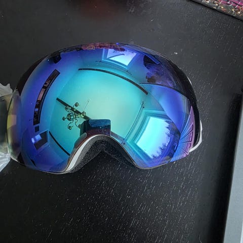 Lyseblått og hvitt perlemor ramme med orange linse og sort stropp. Stroppen har også en gummistripe på innsiden så den sitter godt rundt hjelmen. Noe merker og riper på glasset (se bilde), men ikke midt i synsfeltet og skal ikke påvirke synet. Skumgummien på innsiden rundt rammen er også hel og intakt uten skader.