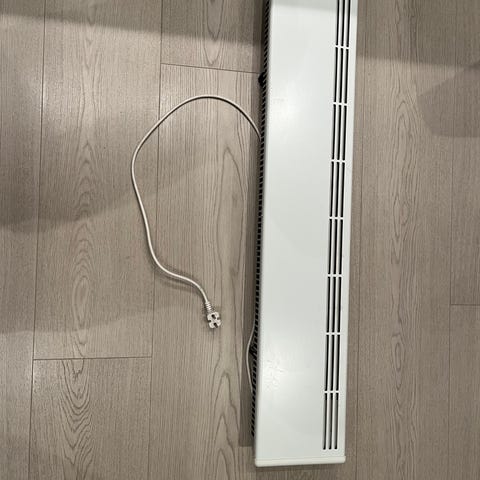 Wilfa Modus MC-1000 panelovn i hvit farge. Ovnen har en effekt på 2000 watt og er utstyrt med regulerbar termostat. Den er designet for oppvarming av mindre rom og har et kompakt og moderne utseende.