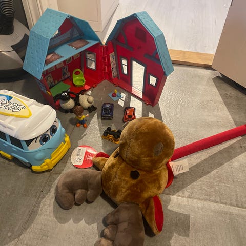 Tallerken, bestikk, smokk og flaske til dukke. Produsert av merket Bayer. Selges fordi vi har lignende. Uåpnet i pakken