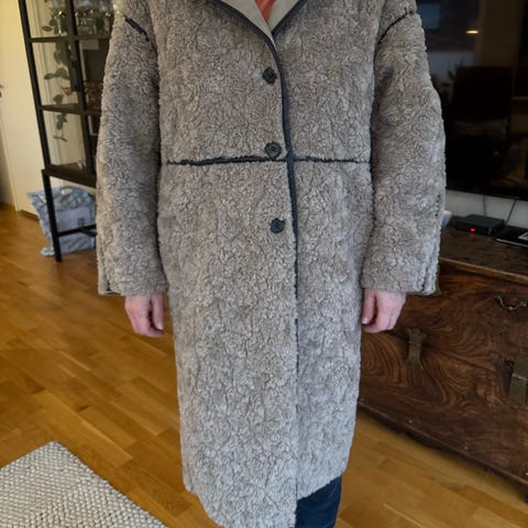 Kåpens materiale holder varmt. Har en skjult knapp foran.