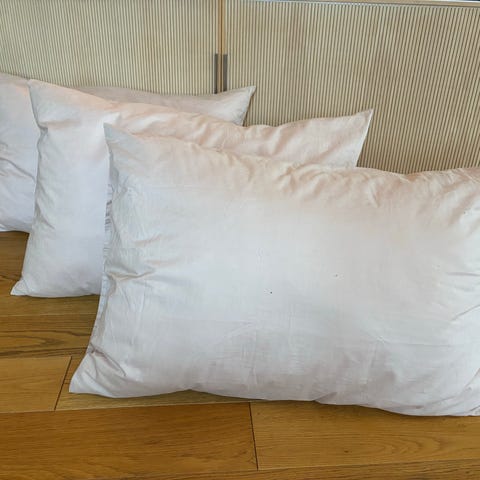 To hotellputer som nye, fylt med gåsedun, med hvitt trekk. Fremstår som nye. Kan hentes på Kjelsås.