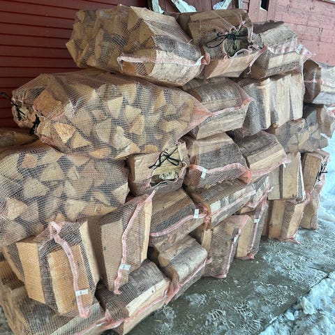 Selger 60-liters sekker med blandingsved av gran og or.