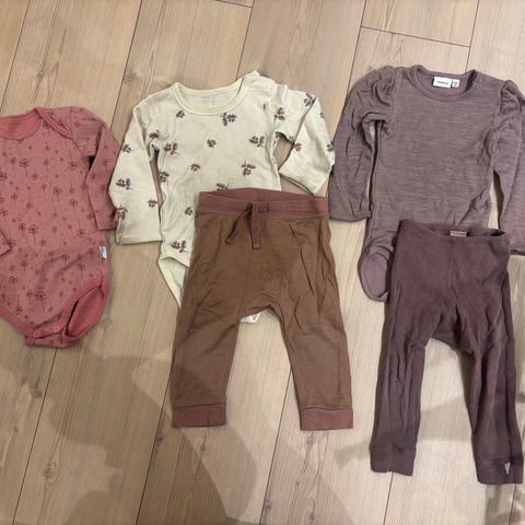 Ullpakke til jente i str 80 hvor ALLE PLAGGENE HAR FEIL/MANGLER I FORM AV NUPPER ELLER SMÅ HULL, men brukandes til barnehage og under andre klær.