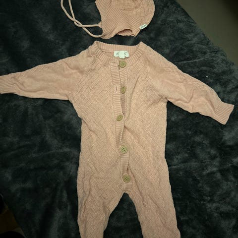 Bukken strikket ulldress str 74 og lue str 6-12 mnd (43-45 cm) i fargen rose.