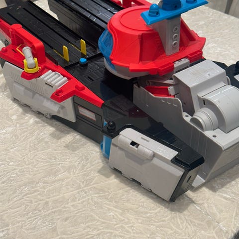 Paw Patrol lekebuss i rødt og blått, designet for barn. Bussen har flere dører som kan åpnes, og den kan romme flere små kjøretøy som følger med. Passer til lek med Paw Patrol-tema.