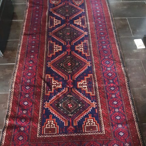 Rødt og blått langt og smalt orientalsk teppe kjøpt på en fabrikk i Tyrkia i 2016. Lekre, klare farger. God kvalitet.